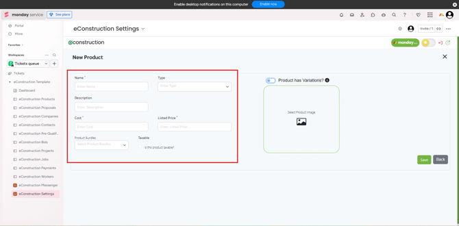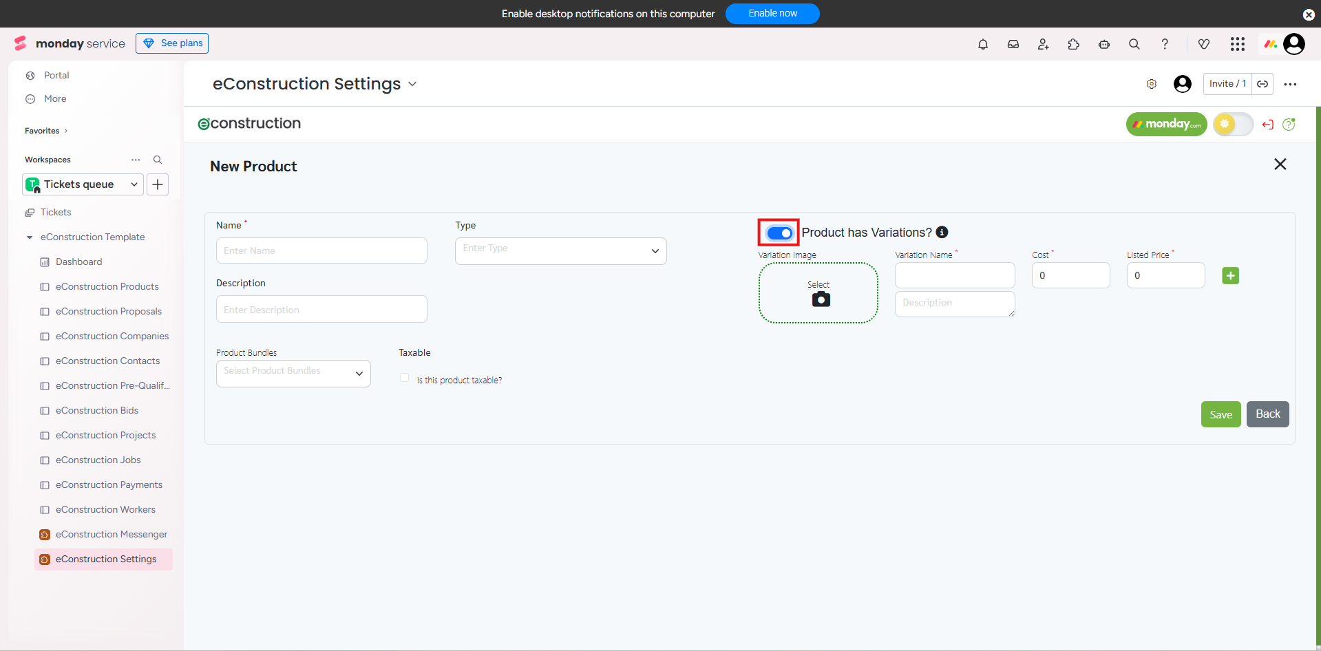 - If your product includes variations, switch on the Product has Variations option, then enter the Variation Name, Cost, Listed Price, and a Description for each variation.