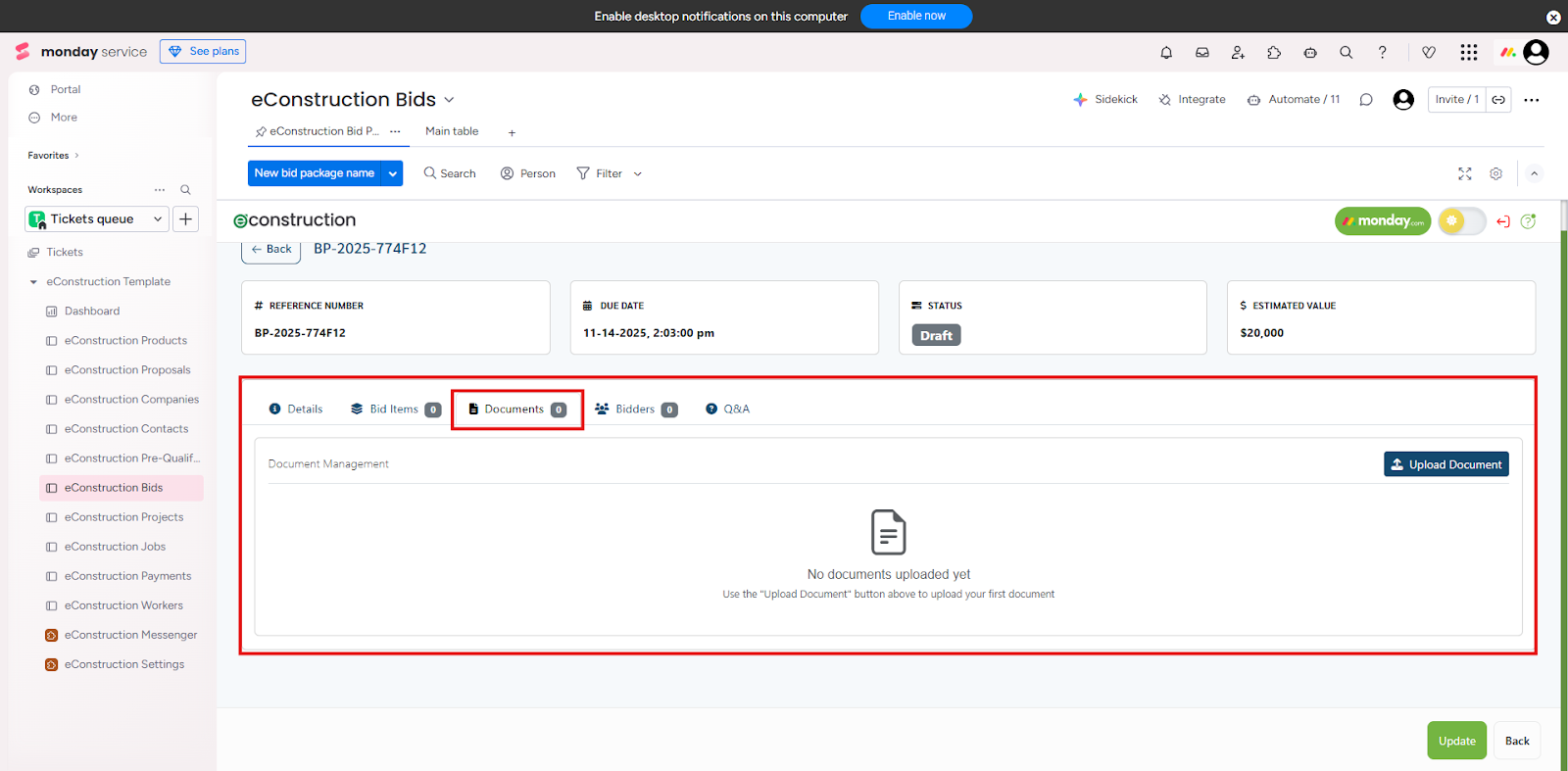 How to Add Documents to a Bid On the bid package's detail page, click the Documents tab. Click the Upload Document button. You can upload any relevant documents (like blueprints or spec sheets) that you want bidders to have access to.