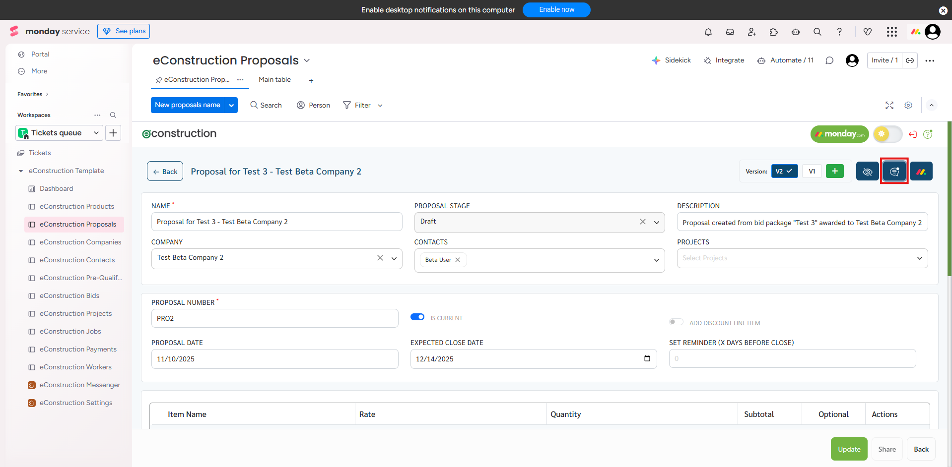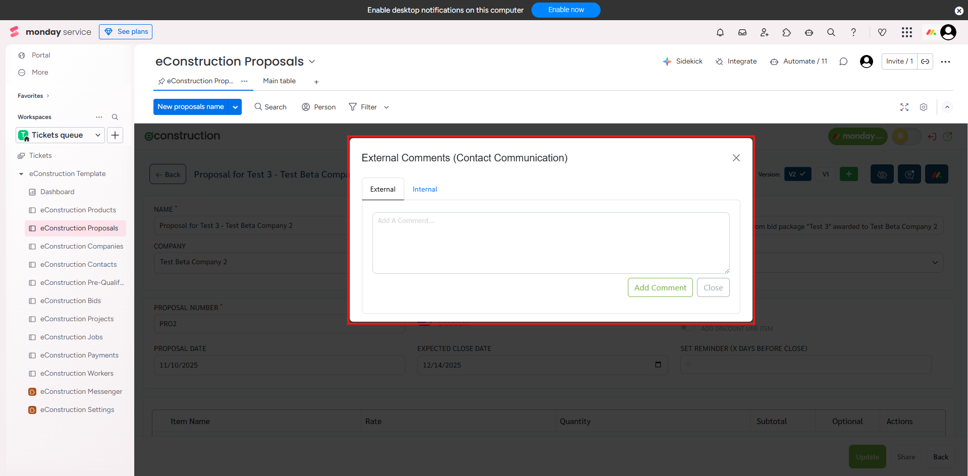 - External Comments: Visible to the client (Contact) if they view the proposal.