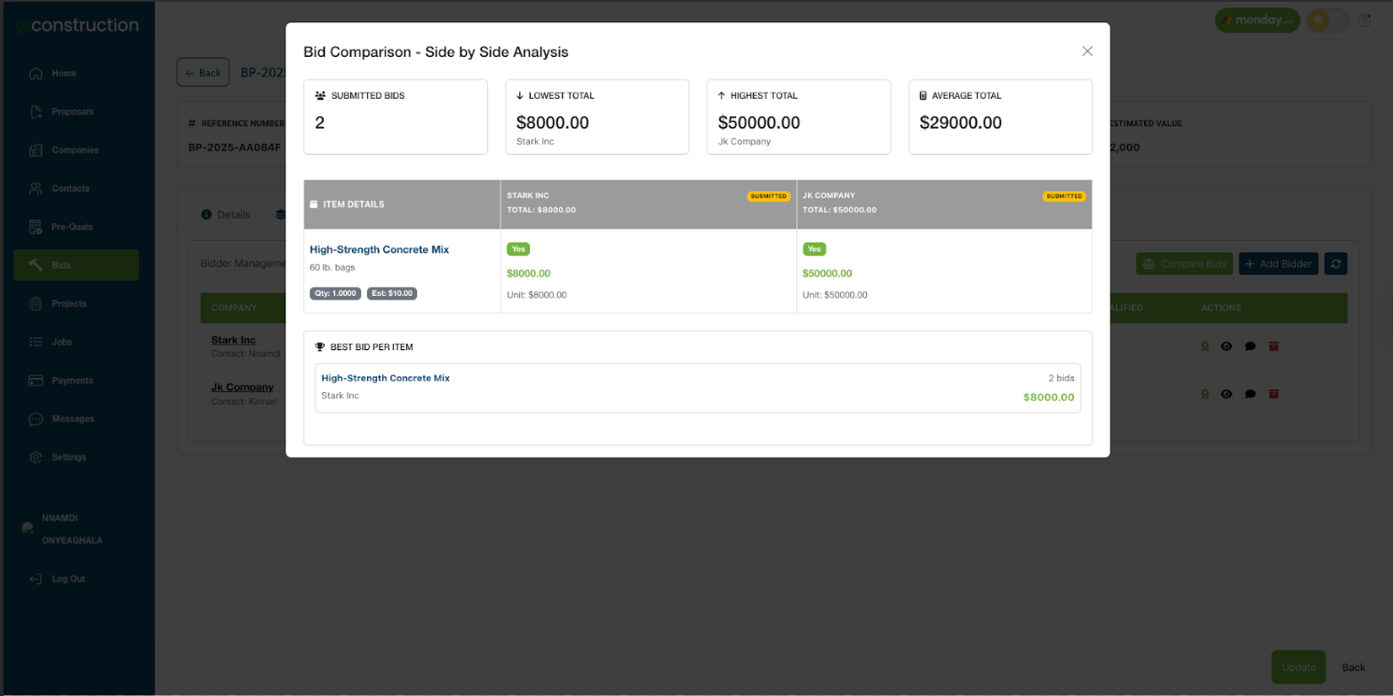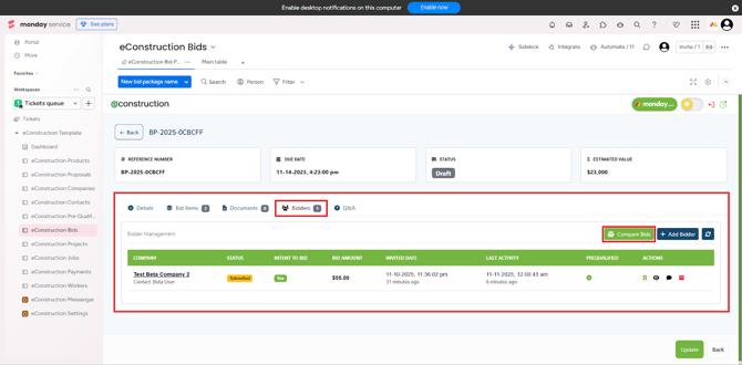 How to Compare Submitted Bids On the bid package's Bidders tab, click the Compare Bids button (located near the top right) . This will open a comparison view that provides a simple analysis of the submitted bids, primarily based on cost.