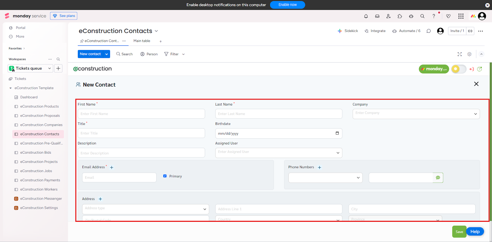 - Fill in the contact's details, such as First Name, Last Name, Company, Title, Email Address, and Phone Numbers .