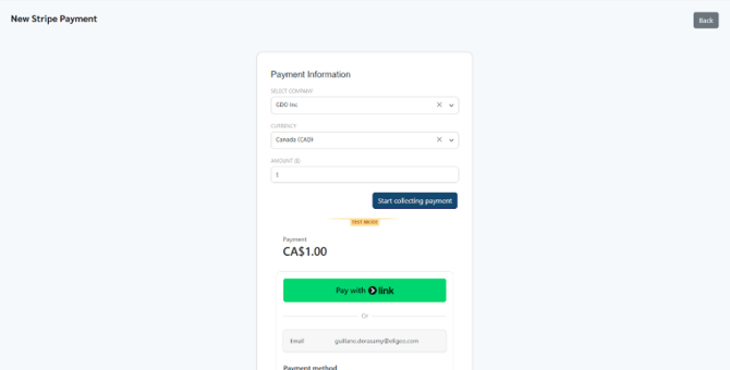 - A "New Stripe Payment" (or Helcim) form will appear.