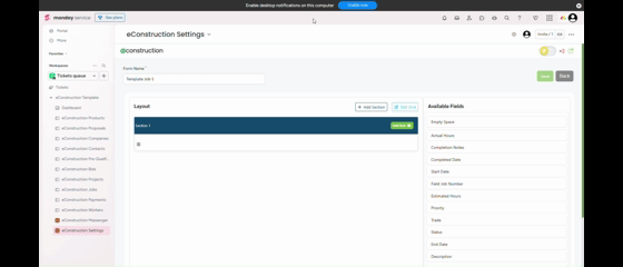 - Use the drag-and-drop editor to build the form layout. Drag fields from Available Fields (e.g., "Worker," "Project," "Status," "Job Description") onto the Layout area.