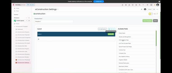 - Drag and drop fields from the "Available Fields" list (e.g., "Company Size," "Annual Revenue," "OSHA Incident Rate," "Bonding Capacity") onto the "Layout" area to build your form .