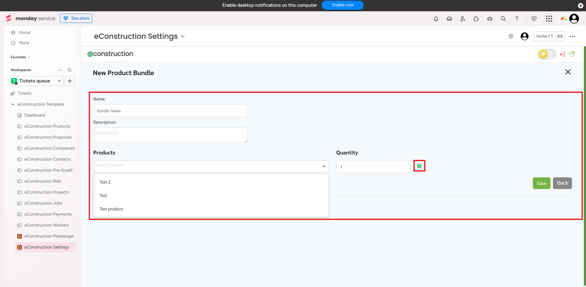 - Under the Products section, select a product from the dropdown (e.g., "Concrete Bricks") and set the Quantity for that product within the bundle .