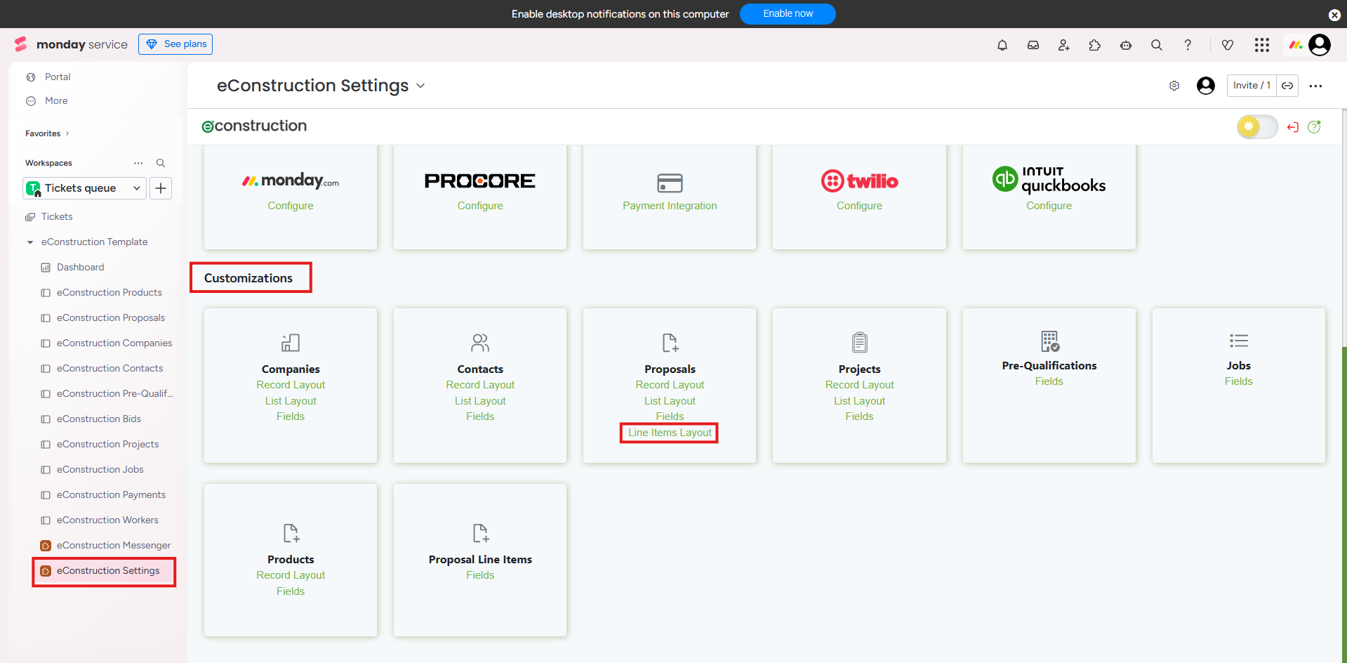 - Click the "Line Items Layout" link directly under the "Proposals" icon.