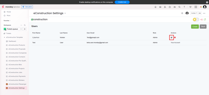 - Click the pencil icon in the Actions column on the far right of that user's row to edit information of the user.