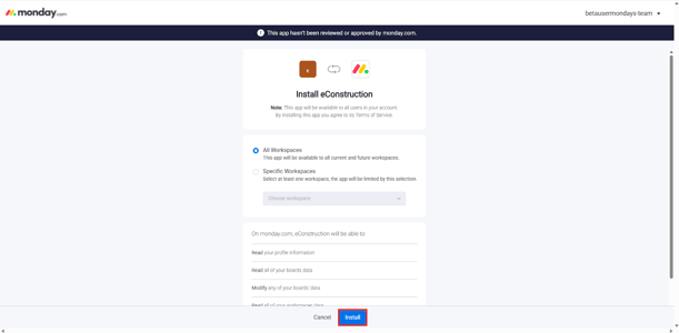 - You will see the app's installation page. Review the permissions that eConstruction requires (e.g., "Read all of your boards data," "Modify any of your boards data").
