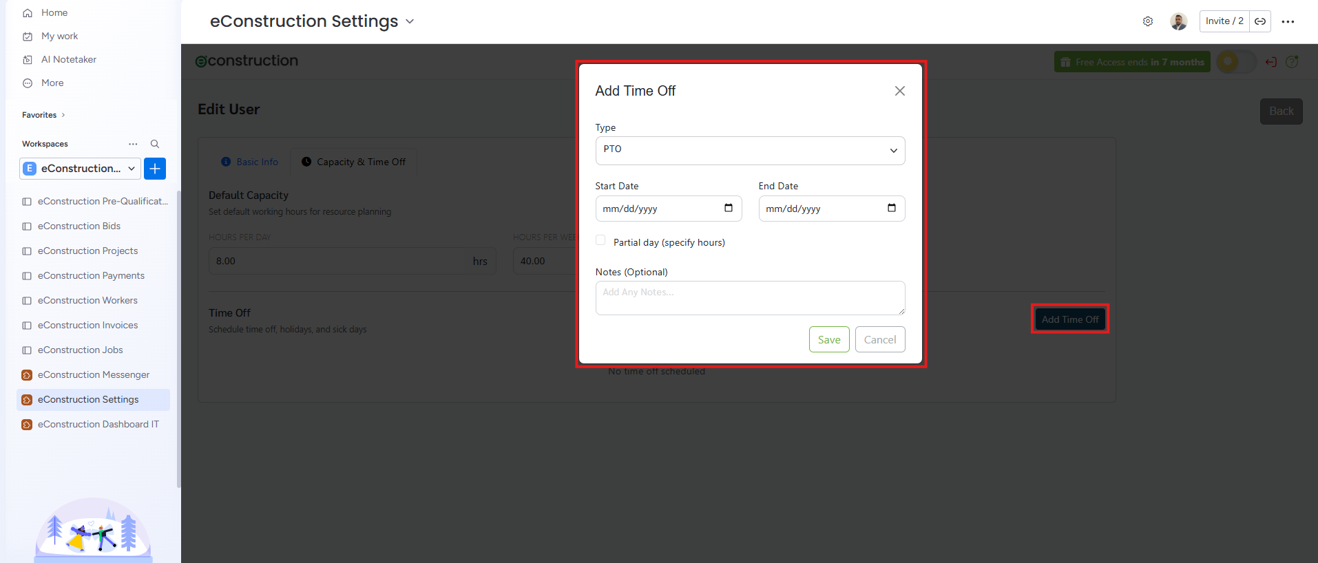 - Select the Type (e.g., PTO, Holiday), Start/End Dates, and Hours Off (for partial days).