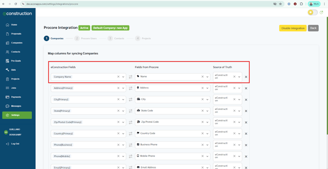 - For each eConstruction Field (e.g., "Company Name"), select the corresponding Field from Procore (e.g., "Name").