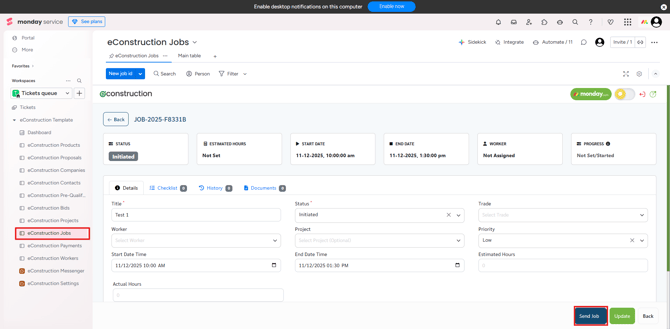 - On the Job Detail page (e.g., "JOB-2025-D1E930"), click the Send Job button at the bottom right.