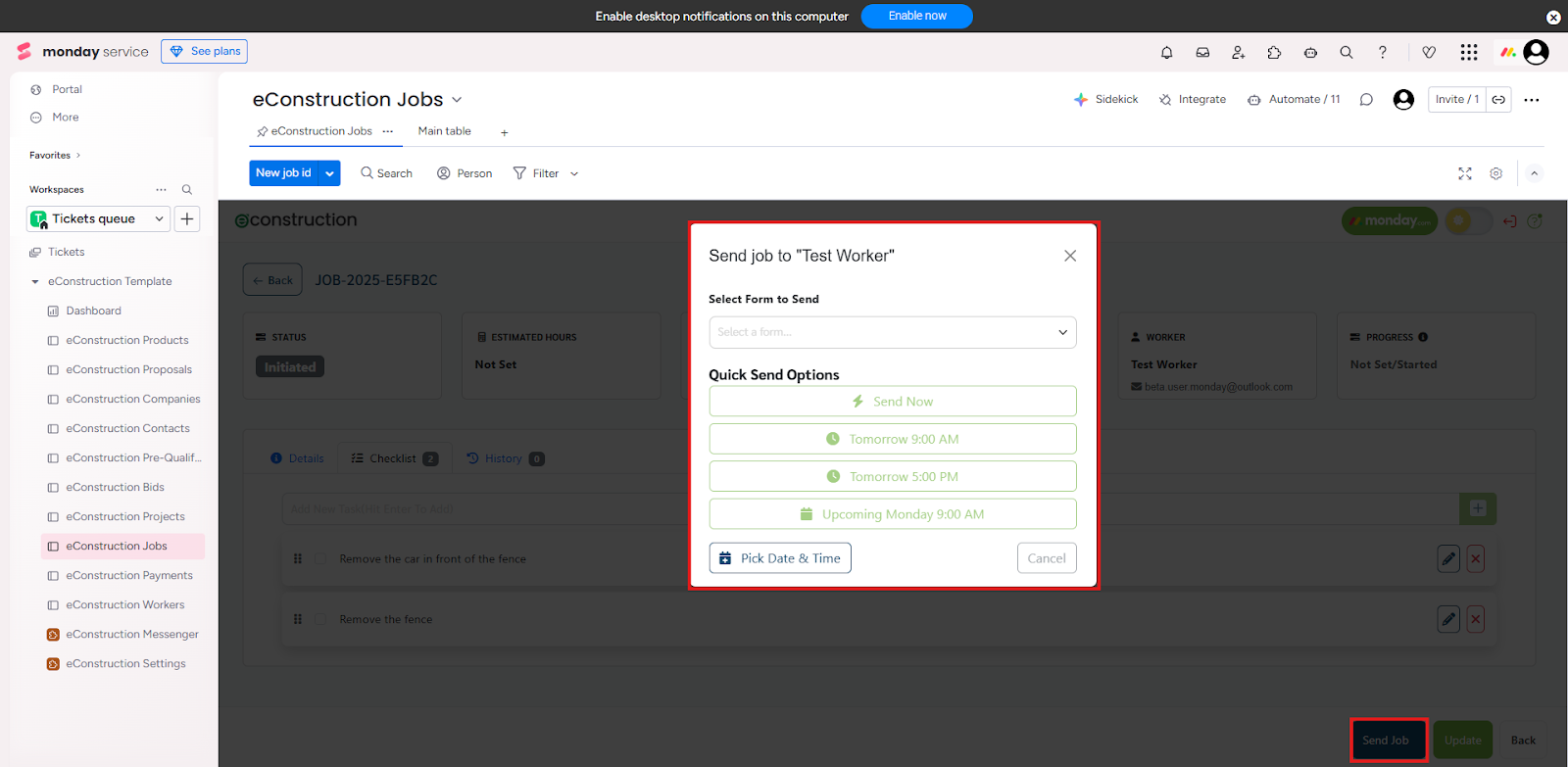 - You can Select Form to Send (if you have multiple job forms configured by your admin).