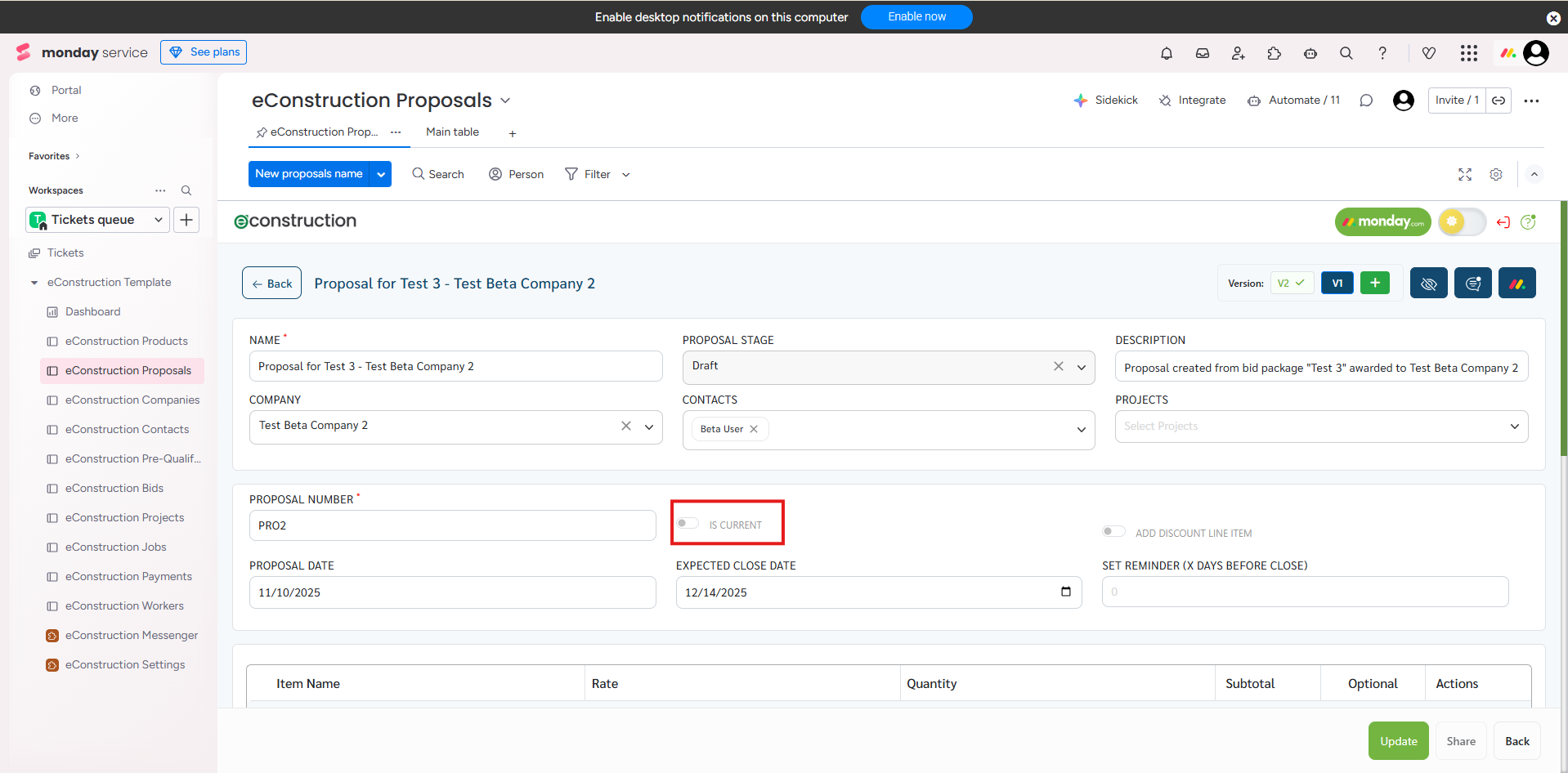 - Locate the "Is Current" toggle switch (this appears as a toggle next to the "PROPOSAL NUMBER" field in the monday.com view).