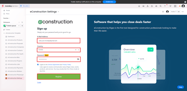 After adding the app to your workspace, you will be redirected to the eConstruction sign-up page to create your administrative account.
