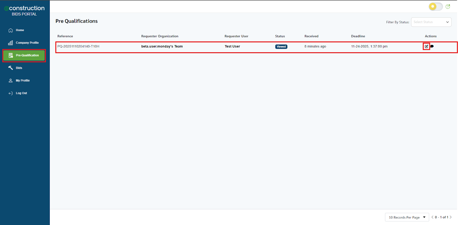 - After receiving a pre-qualification invitation and logging into the portal, click the Pre-Qualification tab.