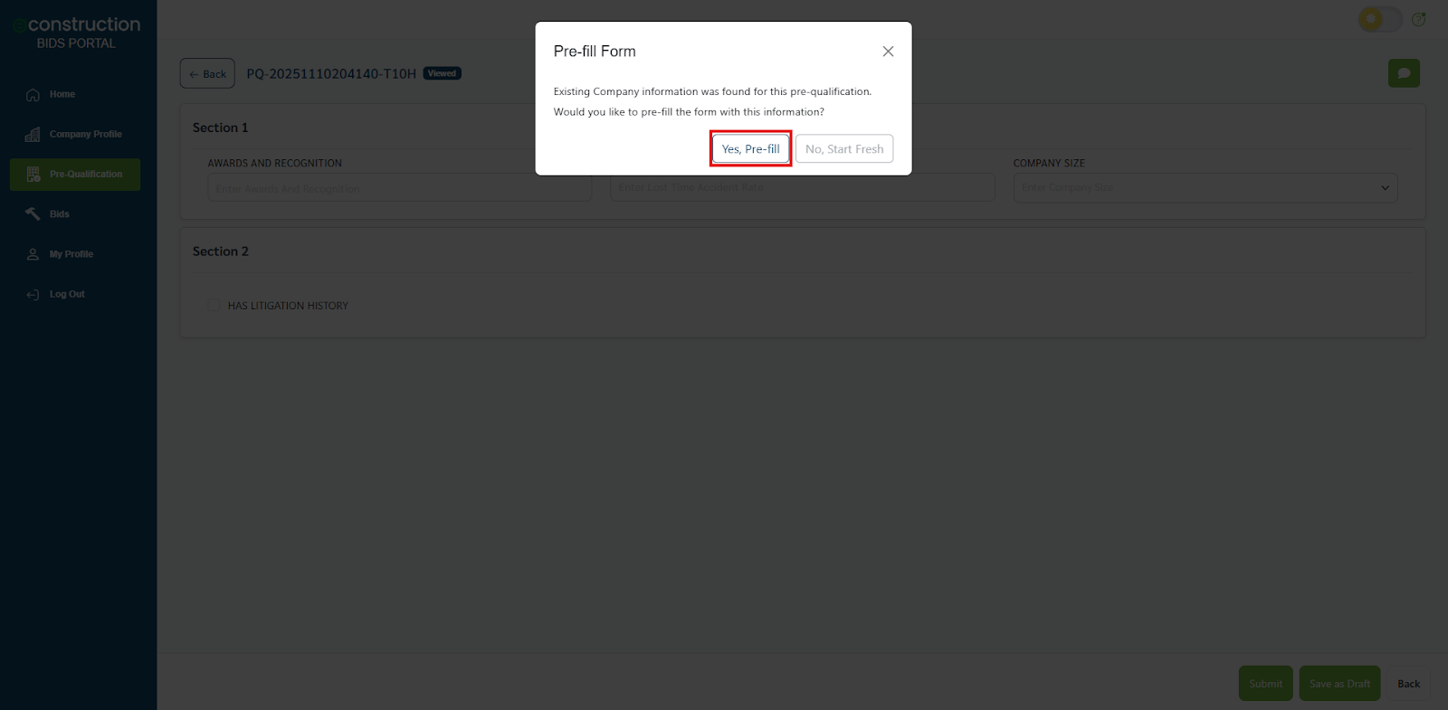 - A pop-up will ask if you want to "Pre-fill Form" with your saved company information or "No, Start Fresh". Select "Yes, Pre-fill" to save time .