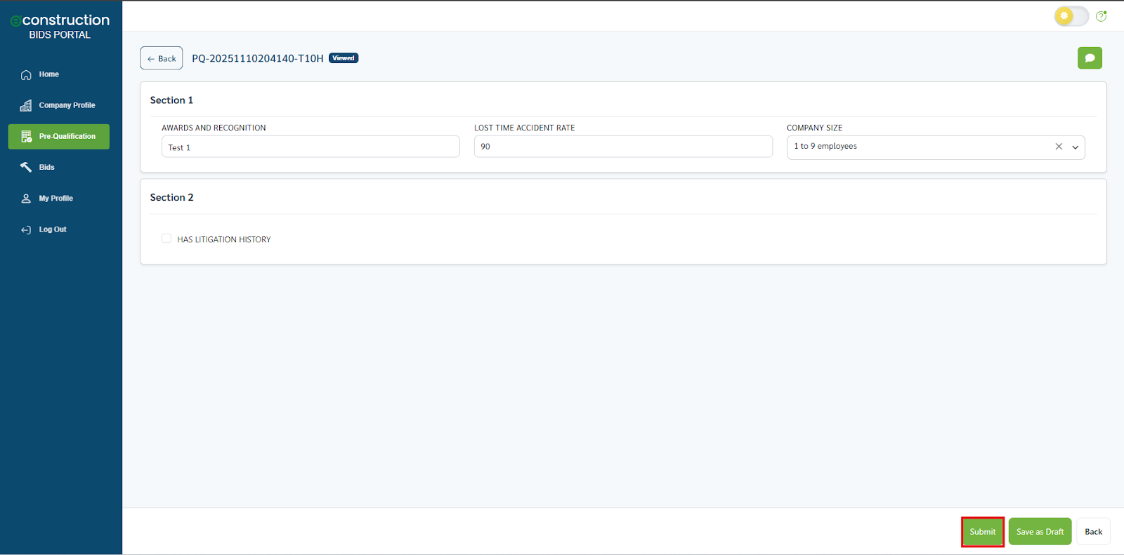- Fill out all the required fields in the form (e.g., "AWARDS AND RECOGNITION," "LOST TIME ACCIDENT RATE," "HAS LITIGATION HISTORY," etc.) .