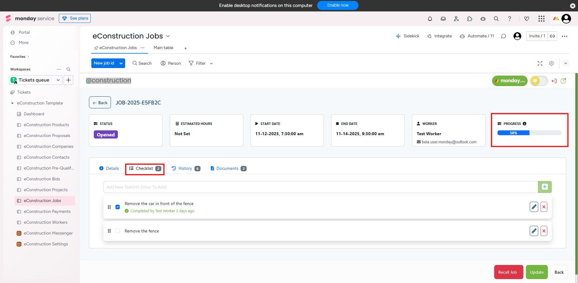 - Detail View: Click on a specific job. The header section shows the overall PROGRESS as a percentage (e.g., "50%") . You can also click the Checklist tab to see exactly which individual items have been completed.