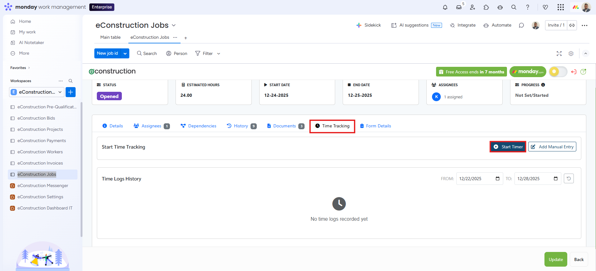Workers and managers can track actual time spent on jobs using a real-time timer or manual entry.