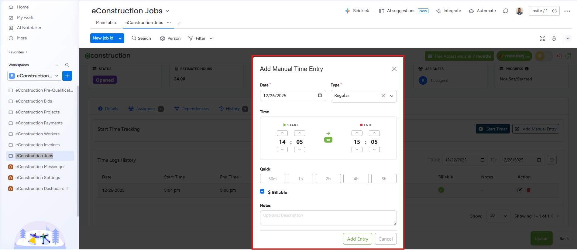 - Option 2 (Manual): Click Add Manual Entry. Select the Date, Start/End Time, and Type (e.g., Regular, Travel).
