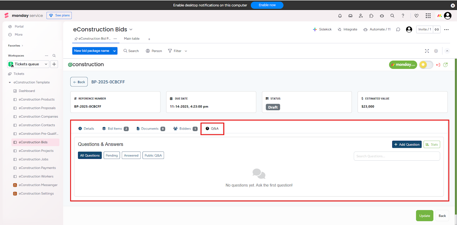 - On the main bid package detail page, click the Q&A tab.