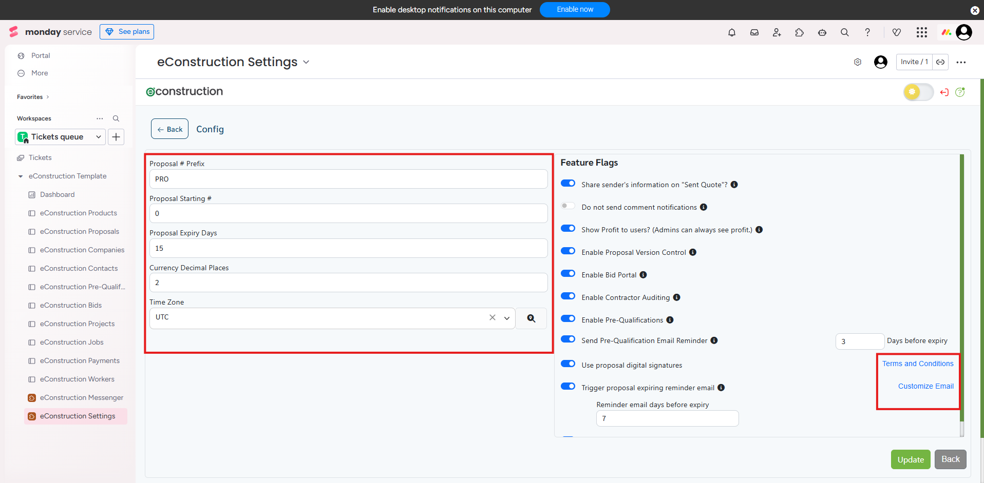 - You can also manage automated email content, such as the "Reminder email days before expiry" and the email templates for "Terms and Conditions" and "Custom Proposal Send Email".