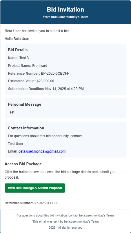 - When you are invited to a bid, you will receive an email. Click the "View Bid Package & Submit Proposal" button to open the Bids Portal .