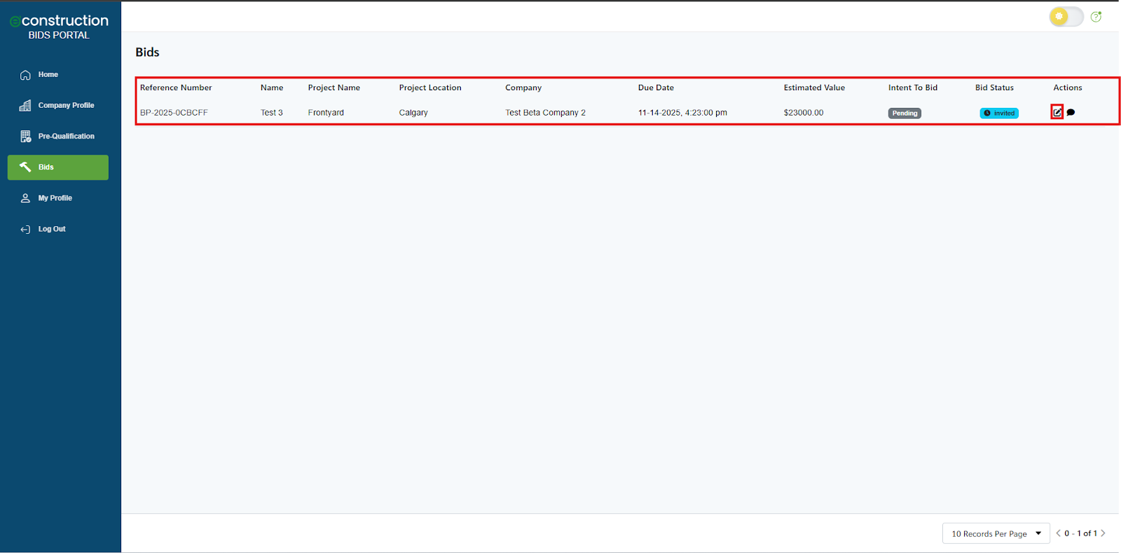 - You will see the new bid listed. Click its Reference Number or the Edit (pencil) icon to open it .