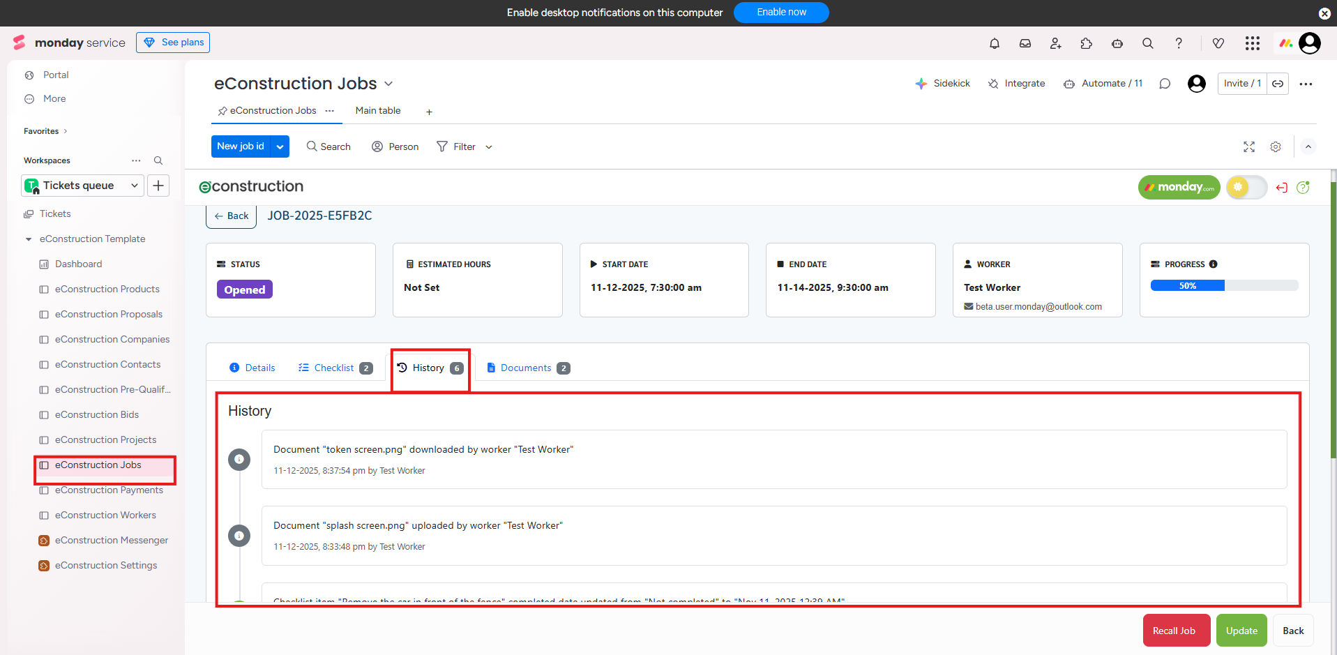 - A log will appear, showing timestamps for actions like "Job queued for sending" and "Job sent to worker."