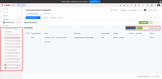 When you access eConstruction within monday.com, your workspace navigation is on the left, and the eConstruction application itself is embedded as your main board view.