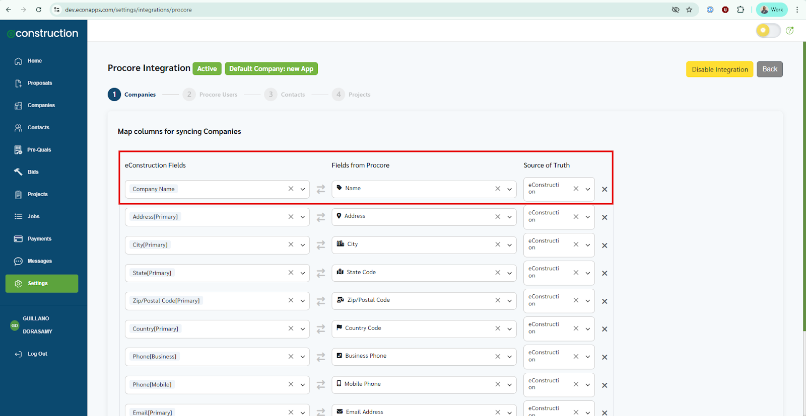 - What it is: The "Source of Truth" determines which application (eConstruction or Procore) holds the master record for a specific field. If data is different between the two systems, the data from the "Source of Truth" will win and overwrite the other .